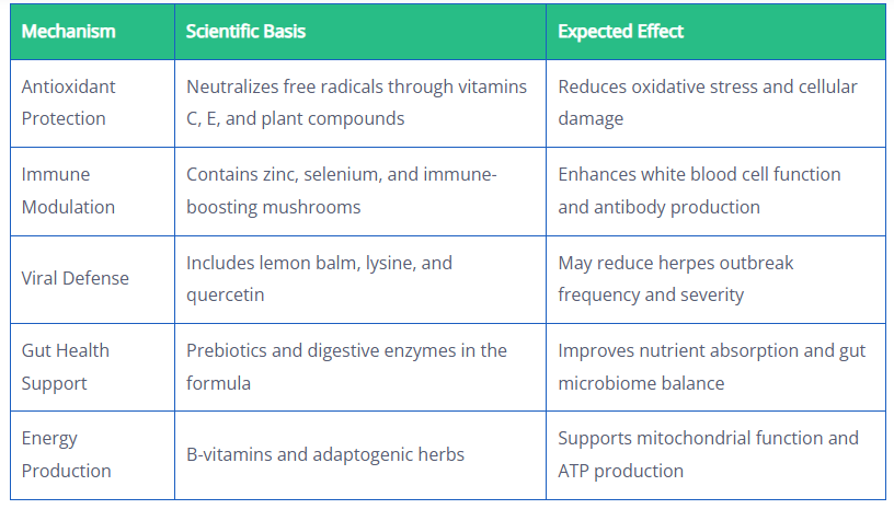 Many of the ingredients function as antioxidants and phytonutrients, which help neutralize free radicals generated by stress, poor diet, and environmental exposure. Over time, this support can contribute to improved energy and resilience.