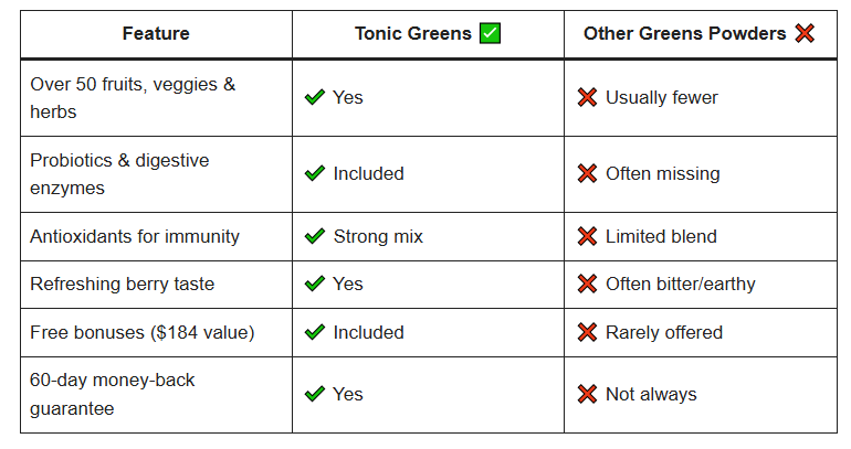 The formula emphasizes balance and consistency. By supporting multiple systems at once — such as digestion, immune function, and cellular health — TonicGreens aims to promote a stronger nutritional foundation rather than quick, temporary effects.